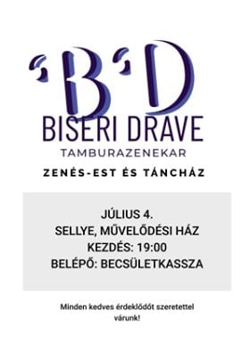 Biseri Drave Tamburazenekar Zenés est és Táncház Július 4. Sellye, Művelődési Ház Kezdés: 19:00 Belépő: Becsületkassza Minden kedves érdeklődőt szeretettel várunk!